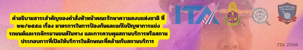 - Order of the Head of the National Council for Peace and Order No. 22/2558 Subject: Measures to prevent and resolve problems of car and motorcycle racing on the road and control of entertainment venues or business establishments providing services in a manner similar to an entertainment venue